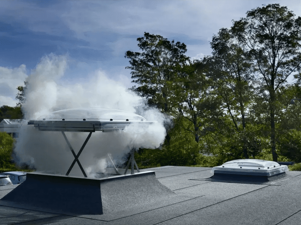 Een ontrokingsvenster voert rook en warme gassen af bij brand, zodat vluchtwegen rookvrij blijven en de brandweer veilig kan ingrijpen.